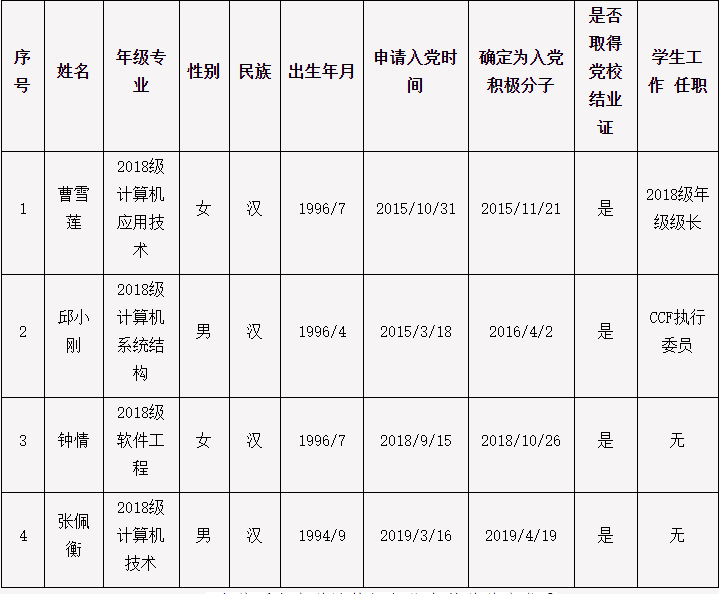 经2018级研究生党支部培养考察,在听取党小组、培养联系人、党员和群众意见的基础上,经党支部(或支委会)讨论,确定曹雪莲等4位同志为发展对象。现根据学校发展对象备案制度进行公示,公示期为2020年11月8日-10日。...