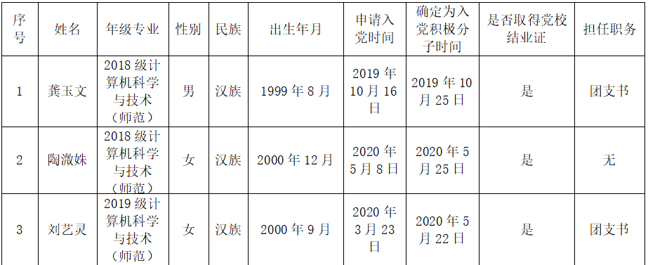 经台湾五级片计算机科学与技术(师范)一党支部培养考察,在听取党小组、培养联系人、党员和群众意见的基础上,经党支部(或支委会)讨论,确定龚玉文等3同志为发展对象。现根据学校发展对象备案制度进行公示,公示期为202...
