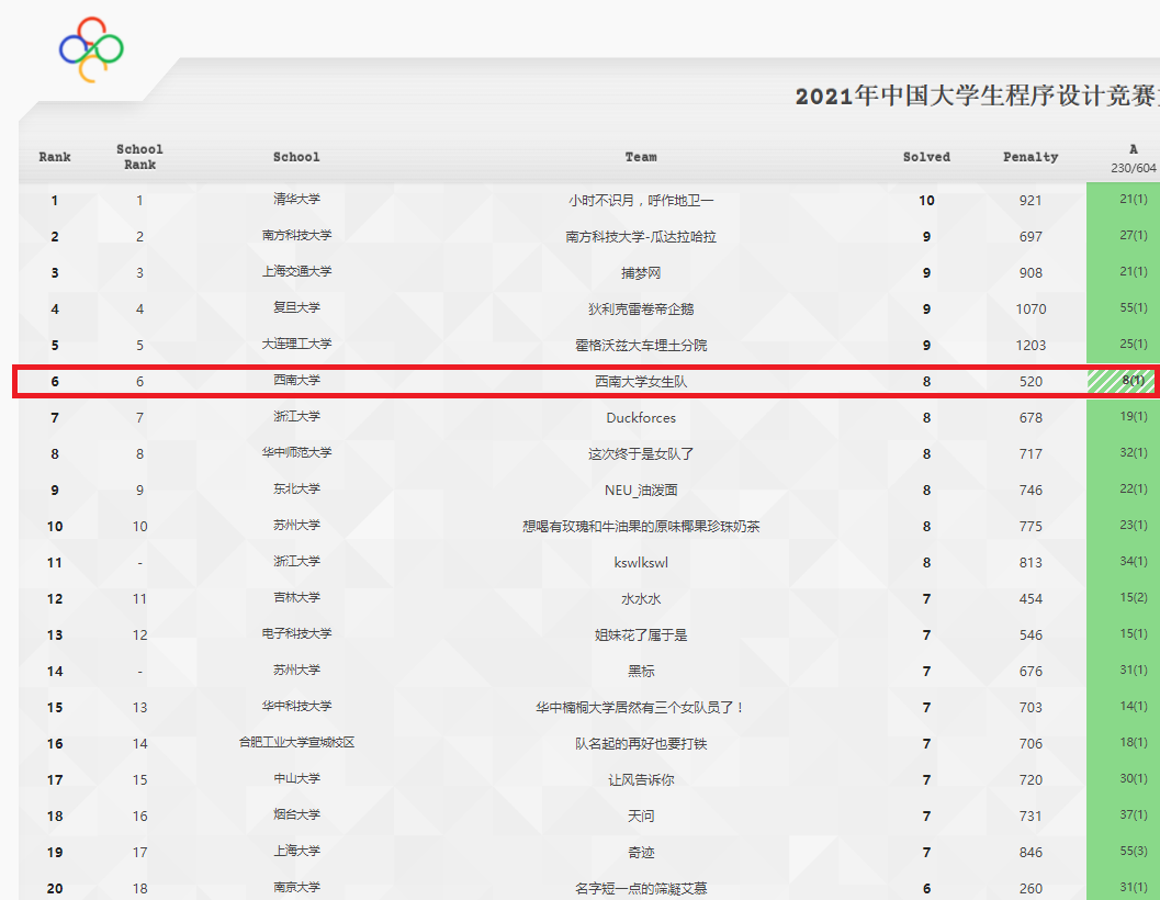 中国大学生程序设计竞赛(简称“CCPC”)由教育部高等学校计算机类专业教学指导委员会主办,是目前国内最高水平的大学生程序设计竞赛。本次参赛高校包括清华大学、上海交通大学、复旦大学、浙江大学等161所高校,从全国4000多支队伍中角逐出252支代表队入围决赛。由张钰涓、李欣悦、陈雯丽三位同学组成的竞赛队伍,经过连续5个小时的顽强拼搏,最终斩获8题,在全国率先通过A题和C题,斩获的8个题目均是一次性提交通过。