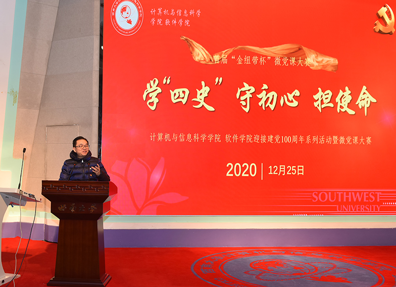为推动广大师生深入学好党史、新中国史、改革开放史、社会主义发展史,引导广大党员坚定理想信念,厚植爱国情怀,凝聚发展正能量。由学院党委主办,以“学‘四史’,守初心,担使命”为主题的迎接建党100周年系列活动暨首届“金纽带”杯微党课大赛于12月25日14:30分在25教一楼报告厅拉开帷幕。全体支部书记、支部委员及党员代表、积极分子代表出席本次活动。党委书记靳拥军,副书记刘作勋、陈智,党委委员邓辉文、梁华珍、王英等六位老师担任大赛评委。