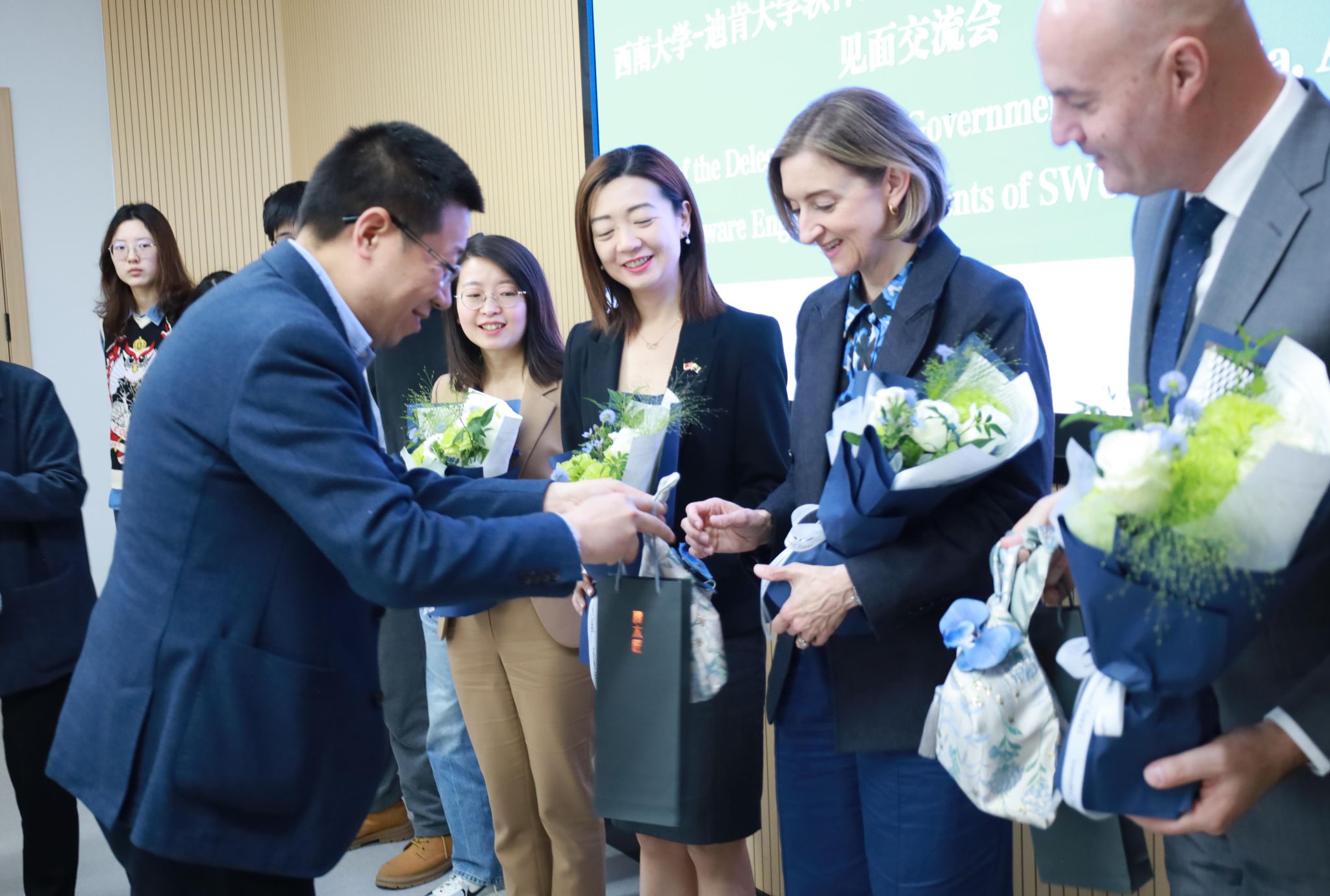 活动渐入尾声,同学们对维多利亚州政府代表团专业而细致的解答表达感谢,并为代表团成员送上小花束,陈武副院长代表学院赠送了西大文创纪念品。交流会圆满结束后,全体参会人员合影留念。此次维多利亚州贸易投资成都代表处的到访搭建起了良好的沟通桥梁,让学生们近距离了解澳大利亚教育体系、文化魅力与行业前沿动态,也为他们的未来学习和职业规划开拓了新思路。