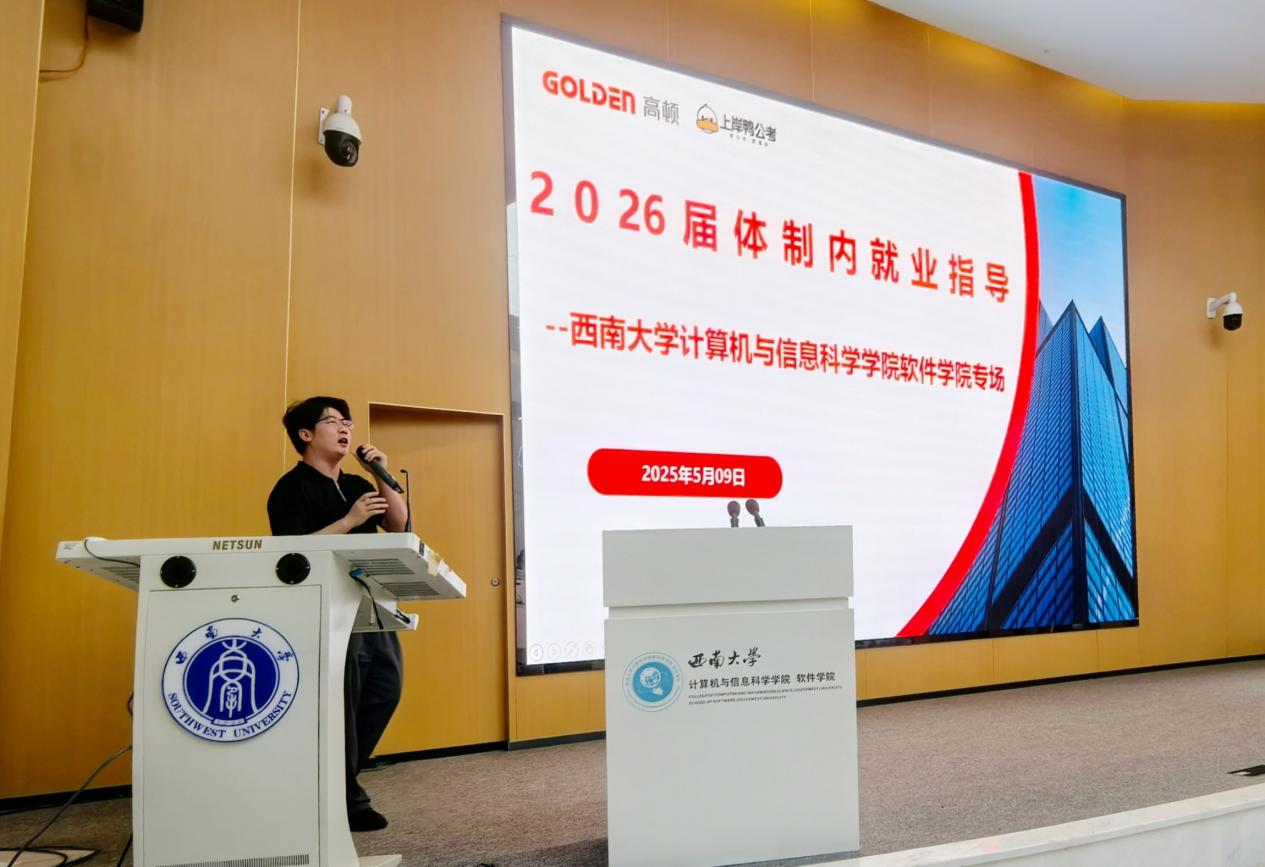 为精准对接学生的职业发展需求,助力学生高质量就业,2025年5月9日下午,学院联合高顿上岸鸭公考在25教学术报告厅举办“码上筑梦·公共部门就业指导”主题讲座。本次活动由高顿上岸鸭公考西南大区总负责人、高顿CDC职业发展中心资深特聘讲师罗凯老师主讲,学院2022级辅导员杨靖欣与200余名学生参加。