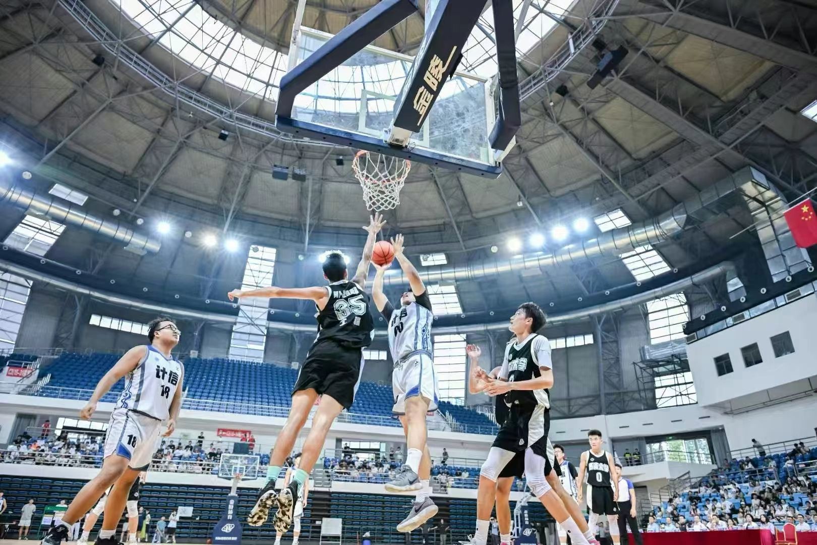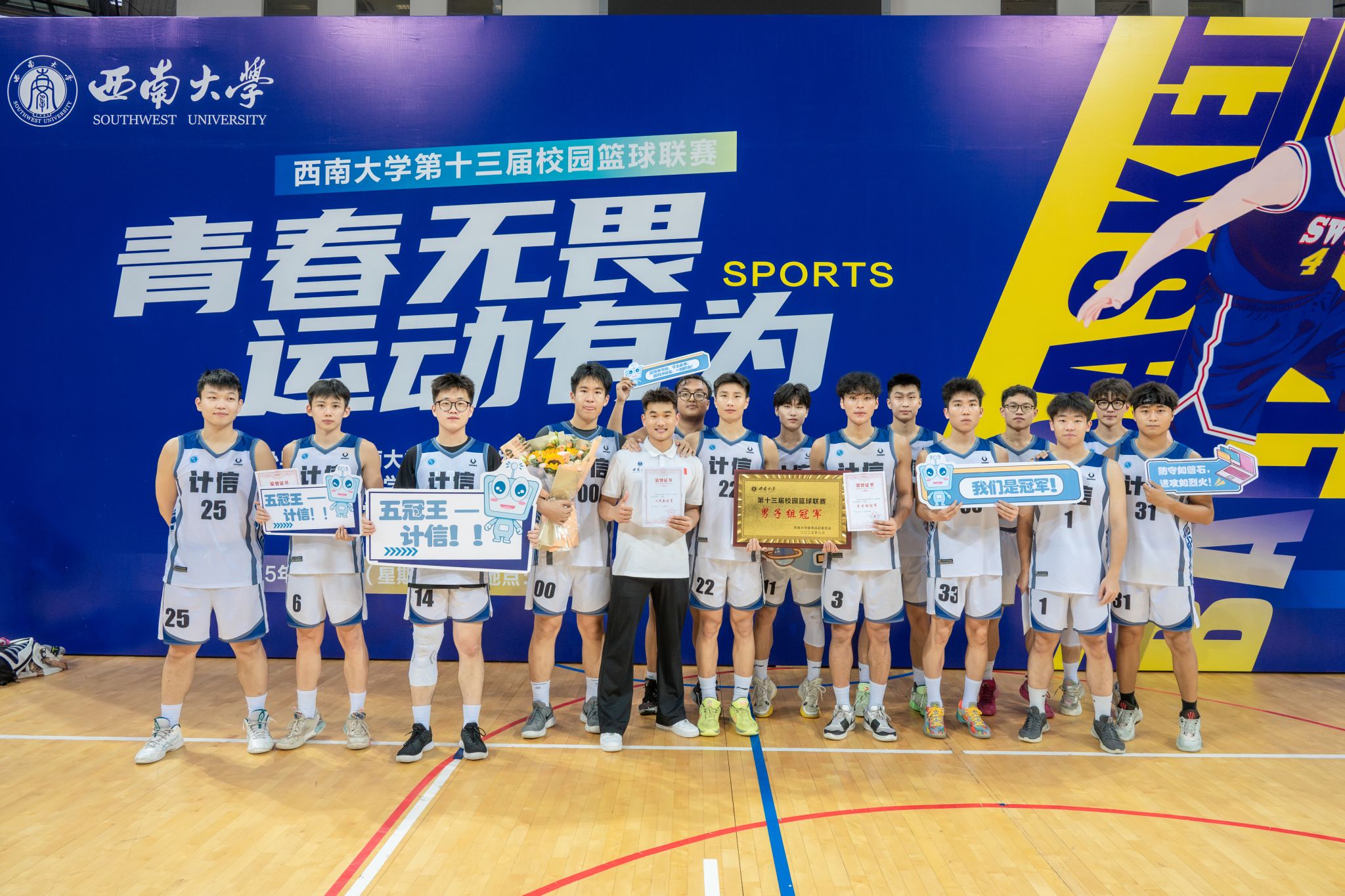 随着终场哨响,学院篮球队全体队员将冠军奖牌高高举起,现场爆发出山呼海啸般的欢呼。观众席上,由学院党委书记孙楚航、副书记王晖、副院长李娅、全体辅导员老师以及200余名同学们组成的“计信啦啦队”举起KT板,拼出“5TH CHAMPION”的图案。这一刻,篮球与计信交织,汗水与智慧共鸣,学院男子篮球队用五连冠的壮举证明:在台湾五级片