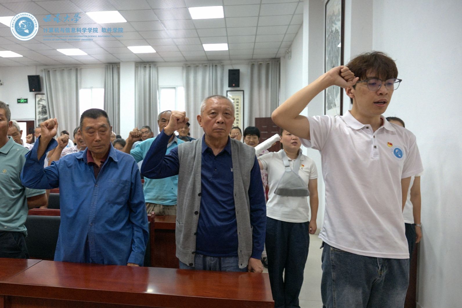 图2-4:成员们与保坪村“光荣在党50年”老党员重温入党誓词