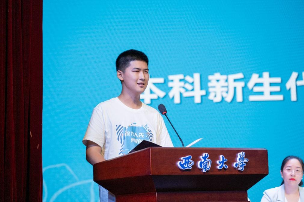 2025级自动化专业王慧卿同学代表新生发言。他分享了从高中到大学的成长感悟,以三个“继续”与新同学们共勉:继续以勤为桨,学习新知;继续拓展潜能,多元发展;继续披荆斩棘,乘风破浪。