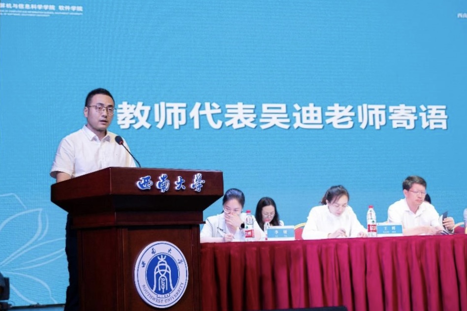 吴迪教授作为教师代表发言。他希望同学们筑牢专业基础:在原理中寻找技术原力;积极参与跨学科项目,激发创新活力;在技术实践中坚守伦理,关注社会价值,做有温度、有担当的计信人。