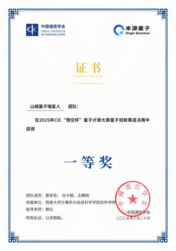 首届中国通信学会“悟空杯”量子计算大赛全国一等奖