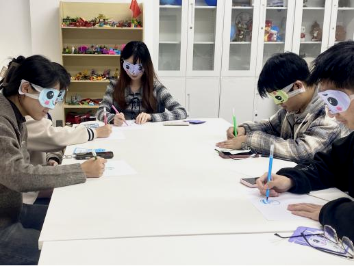 活动伊始,欢快的背景音乐为现场奠定了轻松的基调。主持人引导同学们进行“盲画你的邻座”破冰游戏,大家两两结对,在蒙眼状态下凭借直觉与初步印象勾勒同伴的模样。同学们笔下的线条或夸张或稚嫩,有的画出对方的标志性笑容,有的捕捉到对方独特的发型细节,每一幅画作都是一次心灵的试探与联结。在对彼此作品的打趣与欣赏中,同学们心与心的距离在趣味互动中悄然拉近。
