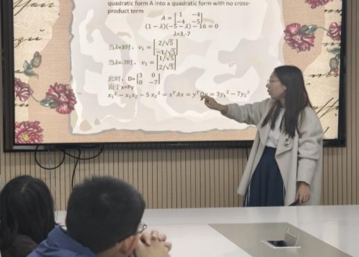 在《线性代数》课堂上,范逸贤同学系统梳理课程核心知识模块,用通俗的表述明晰基础概念及易混淆点,帮助同学们搭建完整的知识框架,针对各类题型,他详细拆解解题思路与关键步骤,引导同学们掌握解题方法。豆柯锐同学紧扣线性方程组、矩阵运算与向量组三大板块,将抽象的定理转化为具体的解题策略;强调掌握核心概念是解题的关键,并现场分享了包含典型例题与解题思路的优质资料,为同学们的期末冲刺提供了强有力的助攻。
