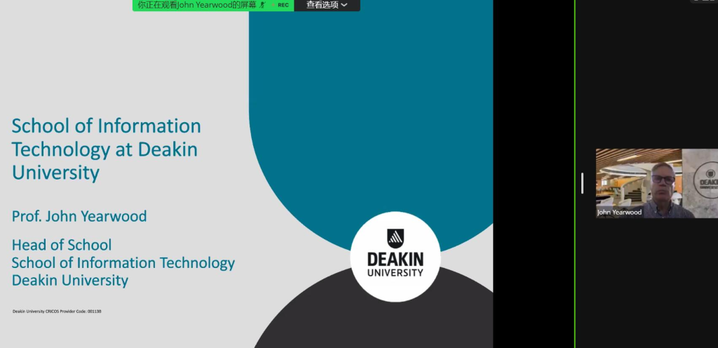 随后迪肯大学信息技术学院院长约翰·雅伍德教授为大家详细介绍迪肯大学和信息技术学院,详细讲解了针对中外合作办学学生的各类优惠政策,并为学生们展示优美的城市环境、迪肯大学美丽的校园环境以及先进的设施。