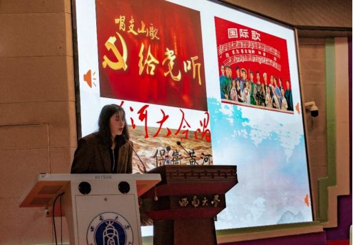 首先,宣讲团成员用一个个感人的视频带领同学们回顾了中国共产党走过的峥嵘岁月,用《唱支山歌给党听》《黄河大合唱》《国际歌》《光荣啊,中国共青团》等激人奋进的歌曲加深同学们对红歌的了解程度,与同学们共情革命先烈对民族深深的热爱。