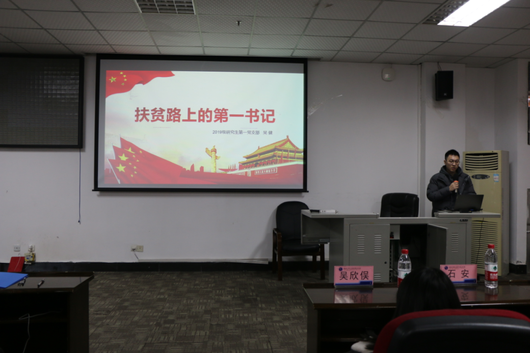 最后,吴健同学的事迹分享——《第一书记》打动了在场的不少同学。来自2019级研究生第一党支部的吴健同学通过短片,带领现场的同学们深刻了解了关于扶贫路上的第一书记——黄文秀。通过对黄文秀同志的感人事迹讲述,以短片配合演讲的方式,给同学们留下了十分深刻的印象。我们从中学习到广大党员干部和青年同志要以黄文秀同志为榜样,不忘初心、牢记使命,勇于担当、甘于奉献,在新时代的长征路上做出新的更大的贡献。