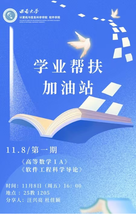 2024年11月8日,2024秋季学期第一期“学业帮扶加油站”在25教1205正式启动。本期活动针对《高等数学IA》和《软件工程科学导论》两门课程进行学习内容分享与重点知识讲解。助力学院学子夯实专业基础,疏解学习难题,增强学习动力,提升学业水平。