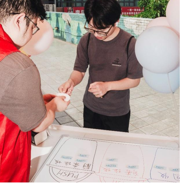 在以“自我更新”为理念的绿植置换区,参与者随机抽取印有各类废弃物的卡片,投递至对应分类箱。挑战成功者获得绿植等小奖品。分类白板前,同学们仔细核对标识,展现了对环保责任的认真践行,也象征着为生活与心灵建立清晰秩序的积极态度。