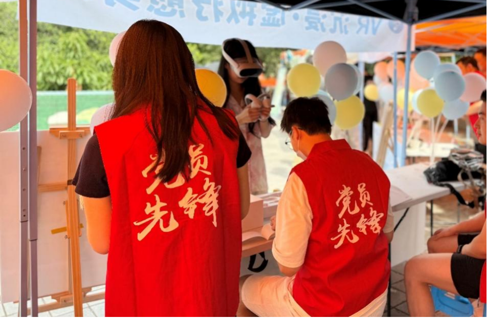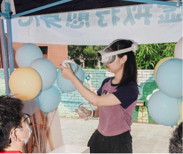 戴上VR设备,手握操控手柄,在VR体验区,同学们跟随志愿者同学的引导进入精心设计的虚拟疗愈空间。或于“海边日出”中跟随引导进行正念呼吸,或在“竹林漫步”里通过手势解压闯关。逼真的沉浸式体验有效缓解压力,活动结束时,许多同学仍意犹未尽。