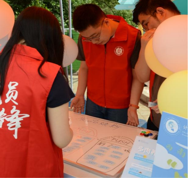 在极具学院特色的“代码盲盒”区,同学们可以体验“大学生情绪管理系统”和“心灵花园成长系统”,通过压力排序和花园浇水小程序,感受代码魅力的同时也了解了自身压力,获得对应心理健康小建议,为心灵“debug”。