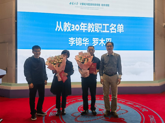 最后,肖国强院长代表学院向两位从教30年的教职工和两位退休教职工表达了最诚挚的感谢,对他们数十年如一日的敬业奉献、勇挑重担的工作态度给予了肯定与敬意,也希望从教30年的教职工继续开拓创新,退休教职工发挥余热再生辉,共同推动学院发展迈上新台阶。