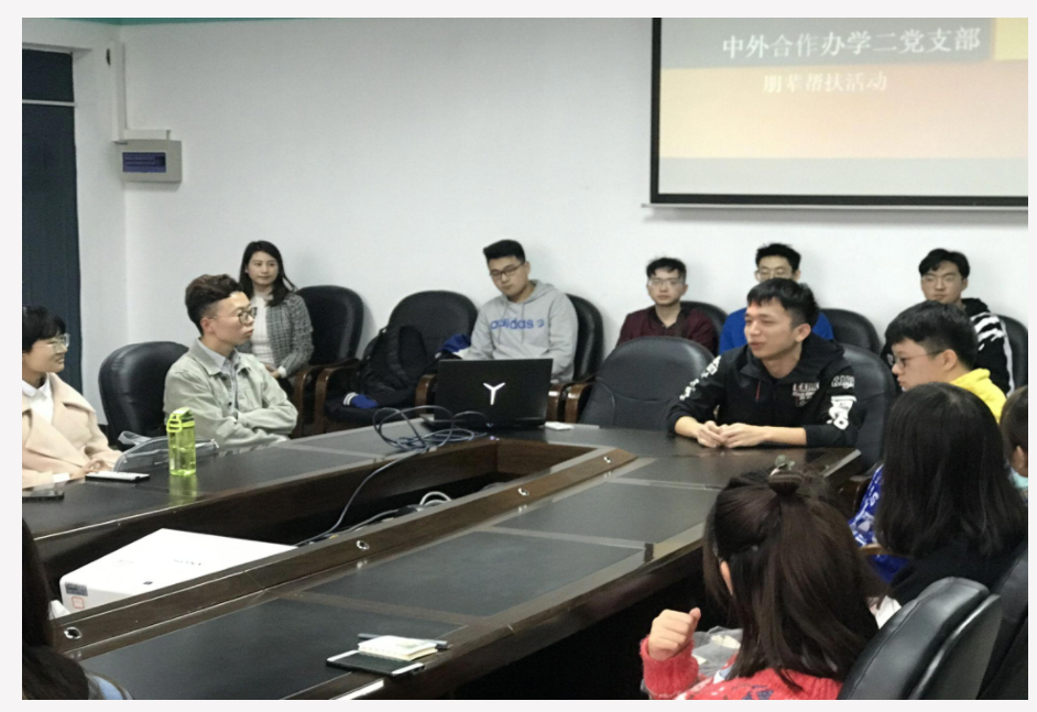 中外合作办学二党支部在25教1314会议室开展“冬日暖阳,真情结对”帮扶活动。活动由中外合作办学二党支部支部书记邵羽西同志主持,支部党员同志以及学院本科2018、2019级部分同学参加。