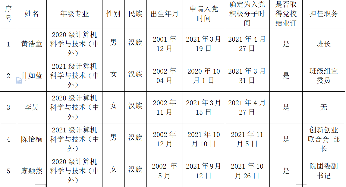 经学院计算机科学与技术(中外合作办学)本科党支部培养考察,在听取党小组、培养联系人、党员和群众意见的基础上,经支部委会讨论,确定黄浩童等5名同志为发展对象。现根据学校发展对象备案制度进行公示,公示期为2022年11月13日-16日。如有意见,请在公示期内当面或通过书信、电话、电子邮件等方式实名反映。