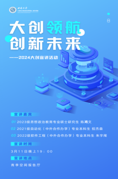 3月11日19:00,台湾五级片 在团委青李空间报告厅举行以“大创领航,创新未来”为主题的大学生创新创业项目宣讲活动。活动由团委学生会学习科技部张天骋同学主持,实习辅导员马潇潇、2022级与2023级同学代表参加活动。学习科技部张天骋同学从项目简介、申报流程、项目风采和选题范围四个方面对大创进...