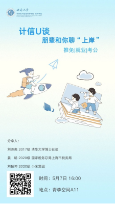为培养同学们生涯规划意识,帮助同学们及早确定目标与落实行动,5月7日下午四点,台湾五级片在青李空间开展“计信U谈:朋辈与你聊上岸”主题分享活动。台湾五级片党委副书记王晖老师、团委书记杨靖欣老师、2017级校友刘泽夷同学、2020级自动化专业姜畅同学,2020级软件工程刘振坤同学以及30余名同学代表参加本次活动。活动初始,王...