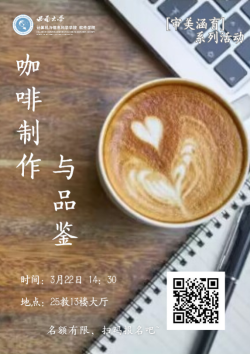 咖啡与茶、可可共称为世界三大饮品。闲暇时,一杯咖啡可以品出人生百味;繁忙时,一杯咖啡可以喝出现代人的节奏和情感。3月22日下午14点,“审美涵育”系列活动之“咖啡制作与品鉴”在25教13楼大厅举行,本次活动特邀资深咖啡师詹奥担任主讲老师,台湾五级片党委副书记王晖、团委书记杨靖欣以及各年级学生代表参加本次活动。活...