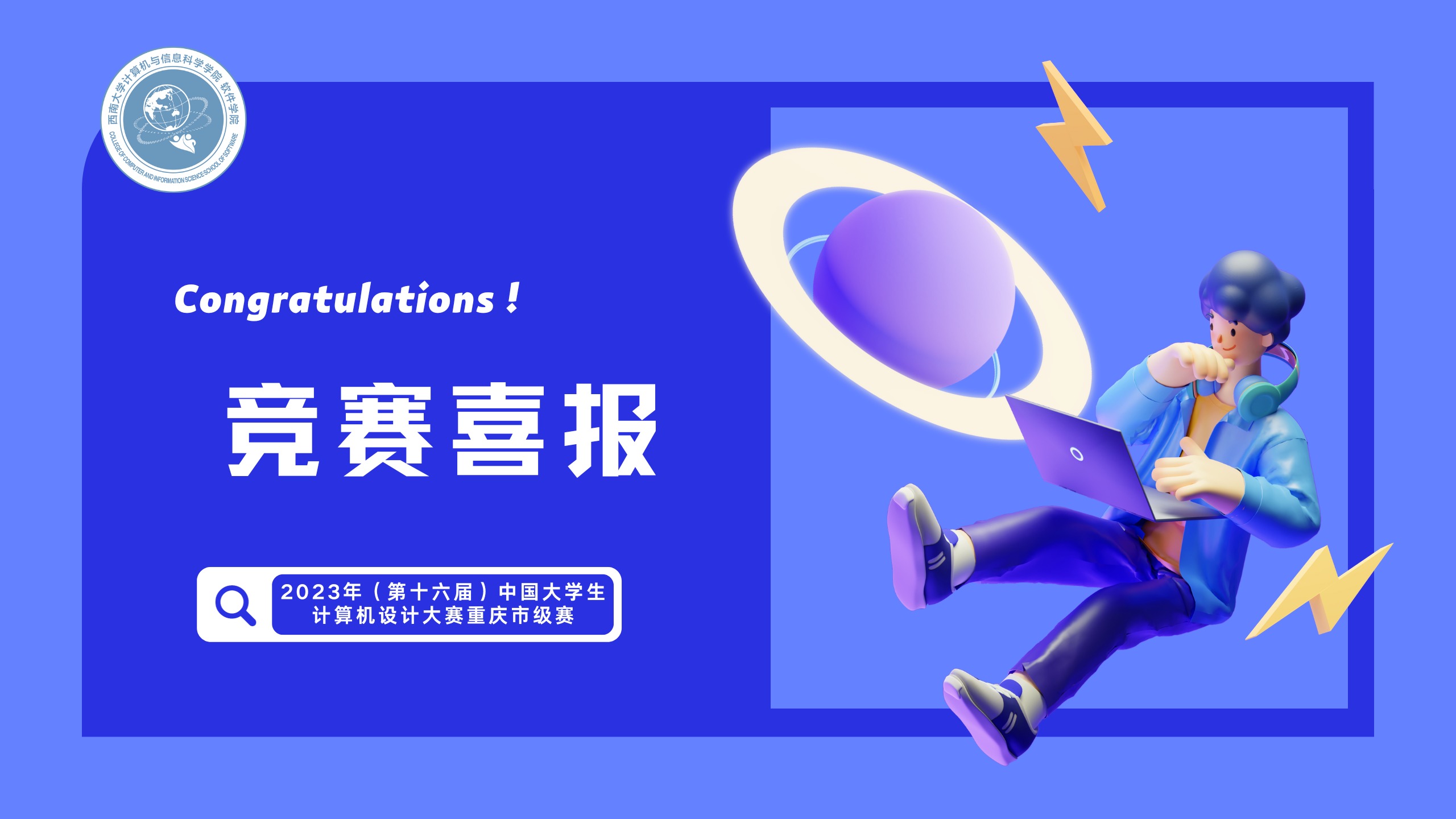 近日,重庆市教育委员会下发了《关于2023(第16届)中国大学生计算机设计大赛重庆市级赛获奖情况的通报》。我院学子喜获佳绩,多支队伍脱颖而出,斩获8个一等奖、4个二等奖、5个三等奖。此外,此次重庆市级赛还评选出了9名优秀指导教师,自动化系范子川老师荣获重庆市赛“优秀指导教师”称号。中国大学生计算机设计大赛...
