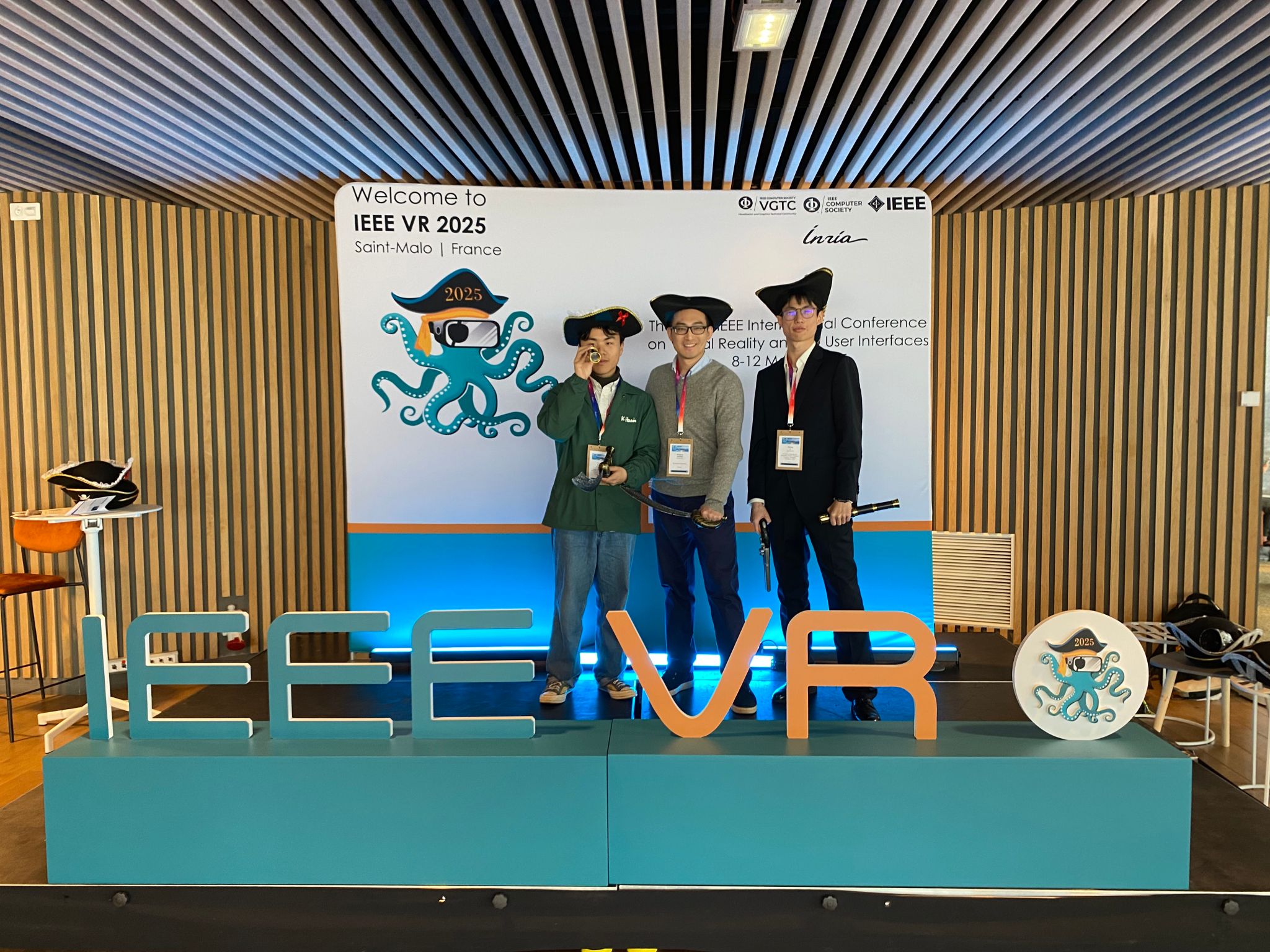 2025年3月8日-3月13日, 国际学术会议第32届IEEE虚拟现实和3D用户界面会议(IEEE VR 2025,//ieeevr.org/2025/)在法国圣马洛召开。台湾五级片 作为第一与通讯单位,两篇IEEE TVCG期刊论文被接收,台湾五级片黄兵姚教授带领台湾五级片研究生李计江和本科生邓宇宸参会。图1:台湾五级片师生参加IEEE VR 2025。邓宇宸(左)、黄兵姚(中)...